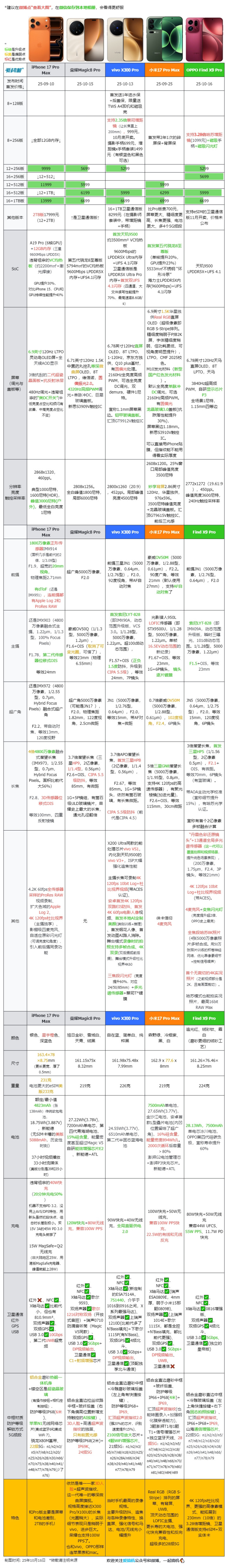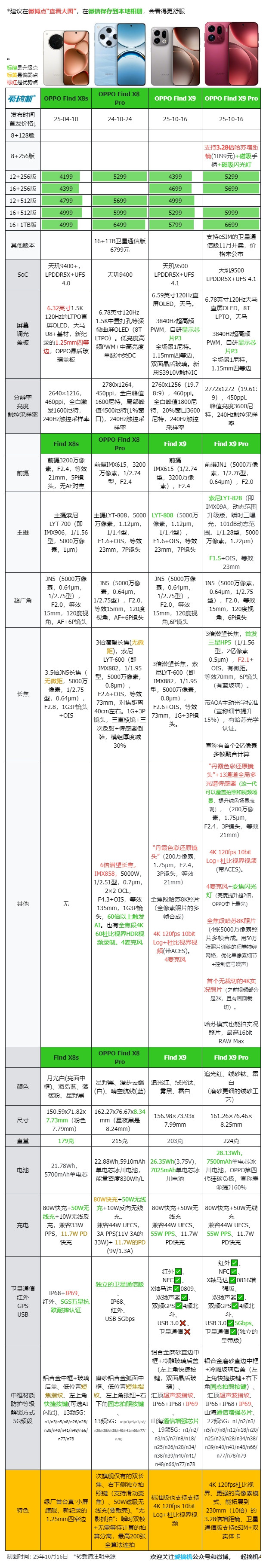 最后例牌,#FindX9系列,与小米17系列、vivo X300系列、荣耀Magic8系列对比。这次为了方便让手机看清楚,对比表会拉得比较长长长长长,大家忍一下。