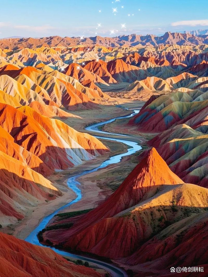 张掖丹霞:七彩山脉似上帝打翻调色盘。色彩斑斓的岩层景观闻名,宛如大地调色板。