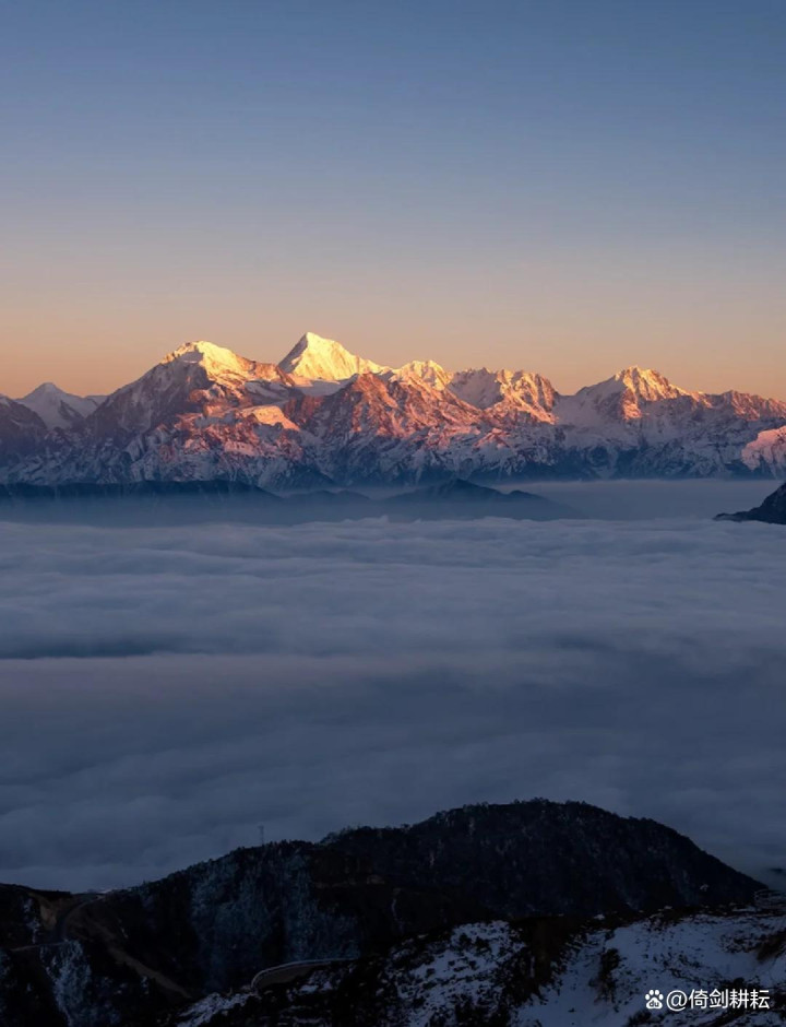 山顶的开阔观景平台能将贡嘎雪山、峨眉山、四姑娘山等蜀中群山及云海、日出等自然奇观尽收眼底,景色壮丽。