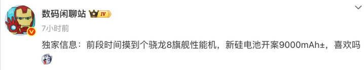 终于荣耀GT2迎来了爆料,近期数码闲聊站在社交平台发帖称:“前段时间摸到个骁龙8旗舰性能机,新硅电池开案9000mAh±,喜欢吗?”